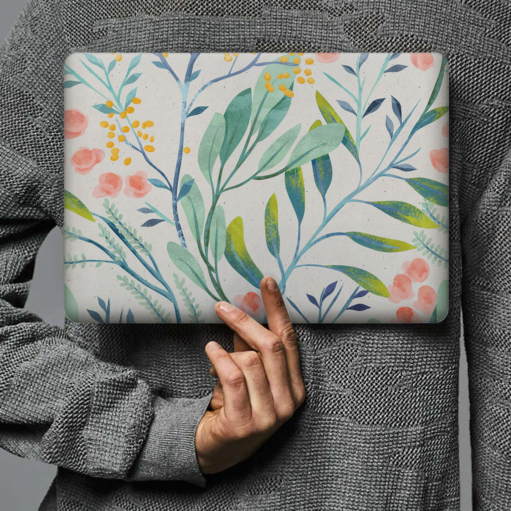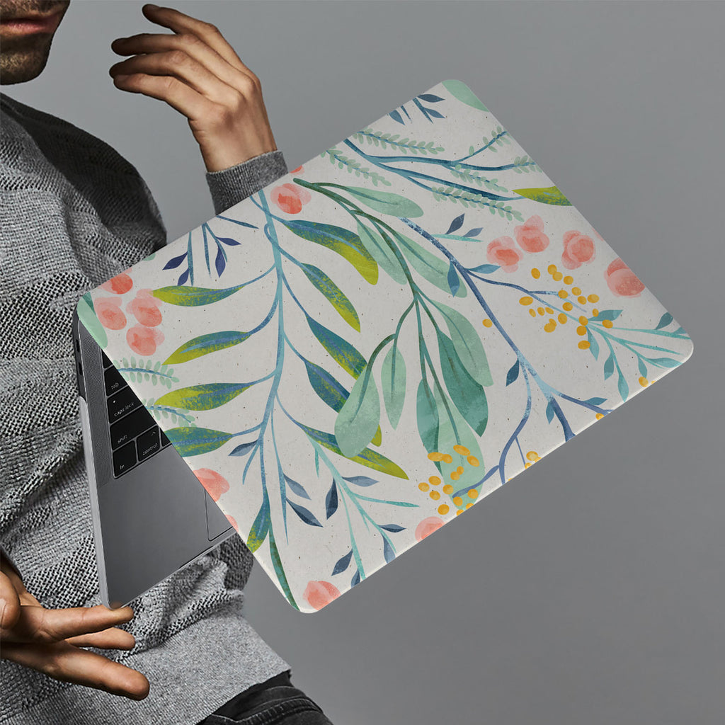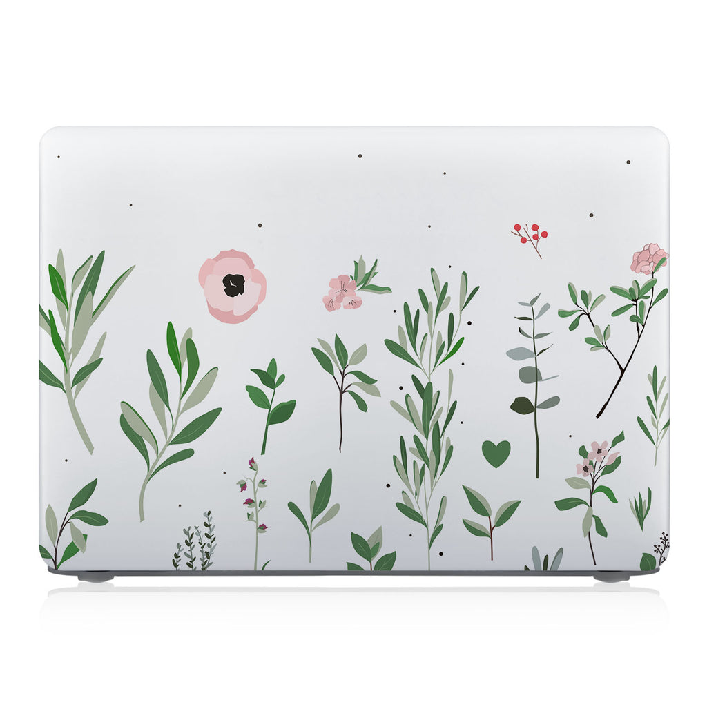 " Botanical prints are everything right now so this Macbook Case is sure to grow on you. Neat stems in tonal green shades and dainty blossom-pink blooms are randomly dotted about, creating an artsy design that's contemporary and chic. This pattern is more on point than ditsy florals but just as feminine. "